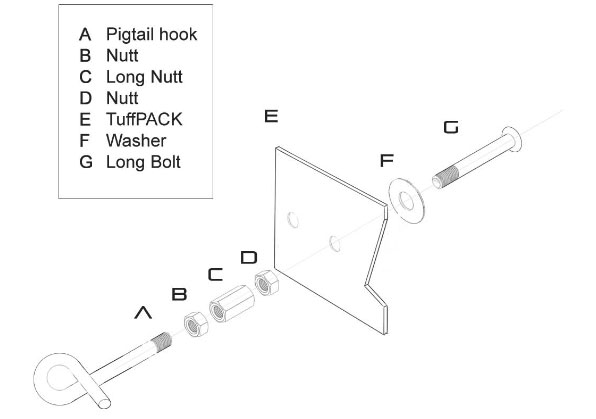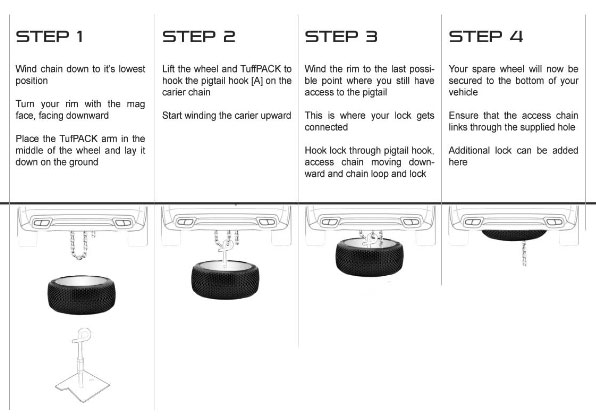 Tuff Pack is a plug and play, plate and hook solution that secures the spare wheel at the bottom of the vehicle without having to add additional mounts or locks to the bottom of the vehicle.